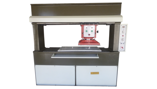 Suajadora de Puente Este tipo de maquinaría es ideal para el corte de sintético, es necesario tener el suaje de la pieza a cortar, la producción es alta ya que el sintético o material a cortar puede ponerse en varias capas y aun así se cortará gracias a la presión que la maquina ejerce.